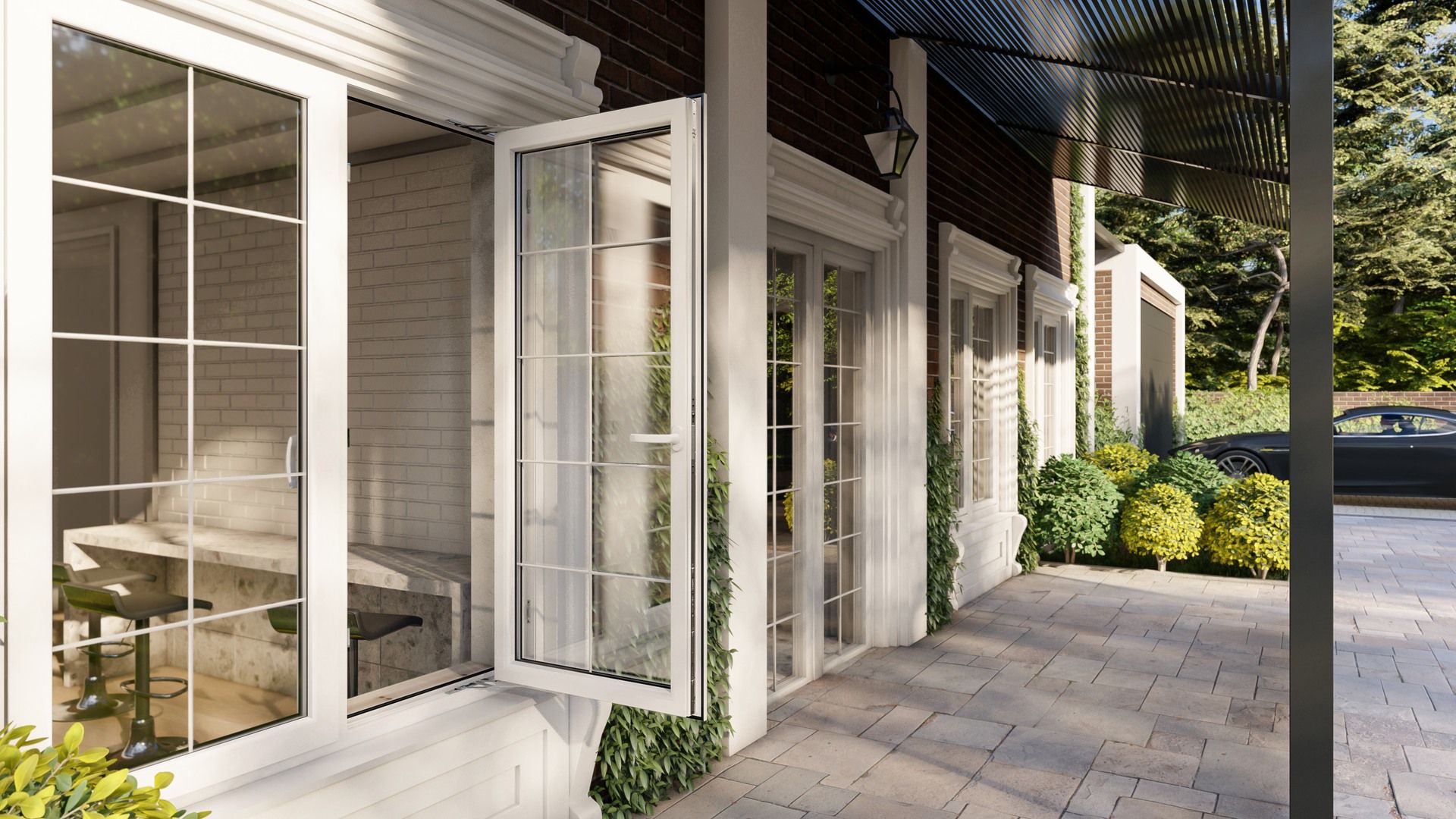 NICO fittings, Friction stay egress hinges DM20 espagnolette with a double roller that enables full closure (tight) or closing with trickle ventilation. Burglary protection.