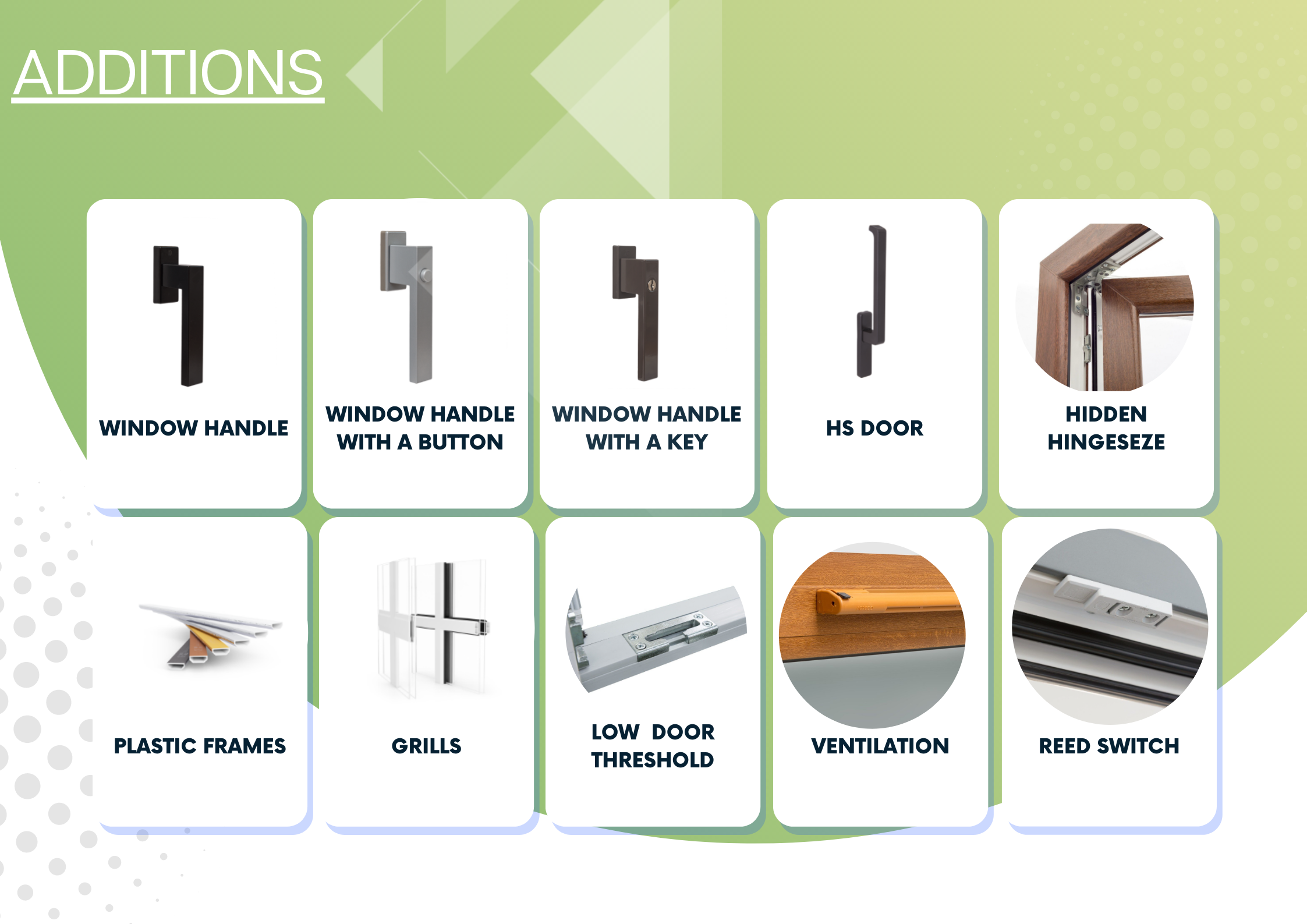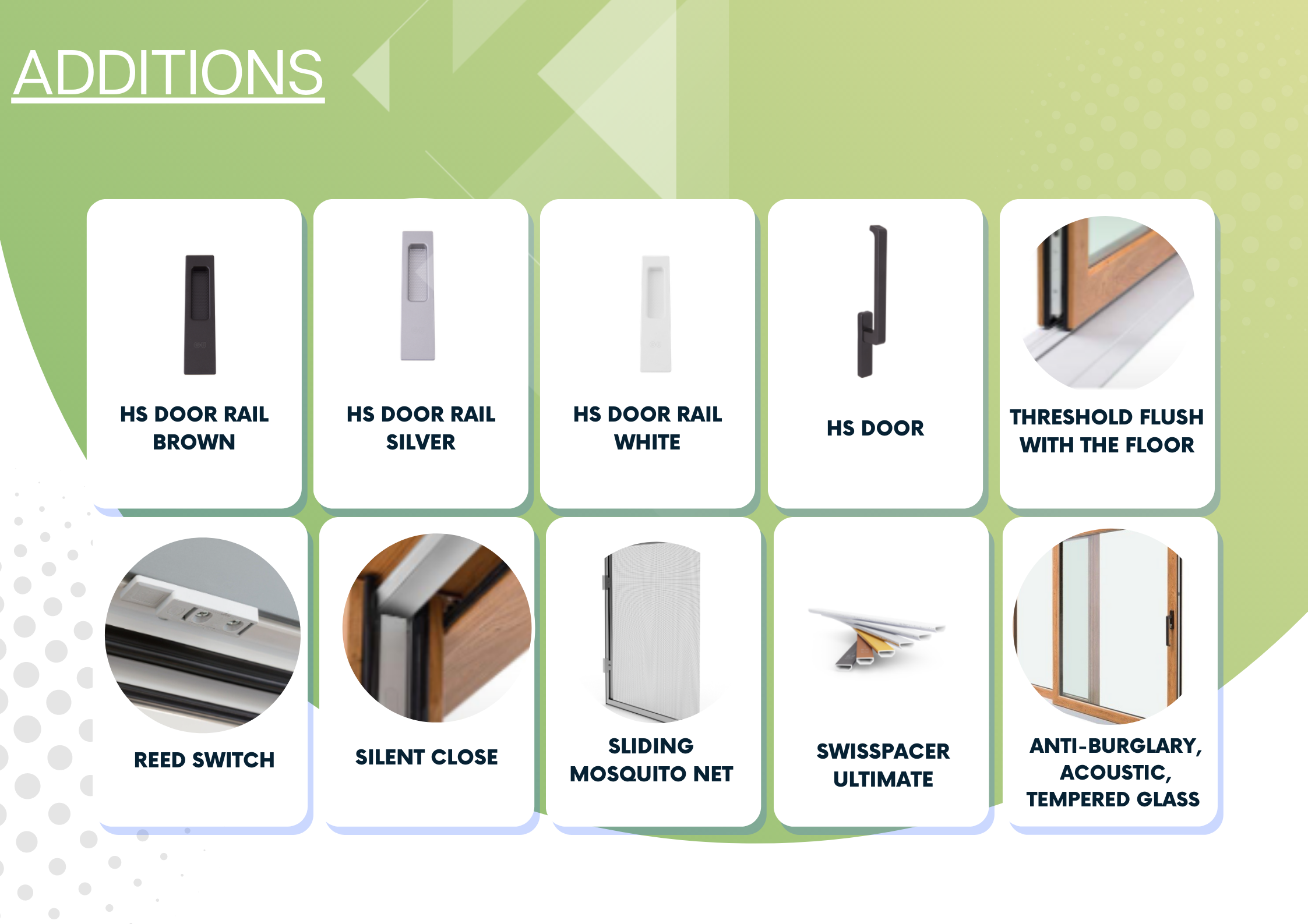 The possibility to apply glass with enhanced sound insulation, tempered, saftye, anti-burglary, ornament, solar protective.