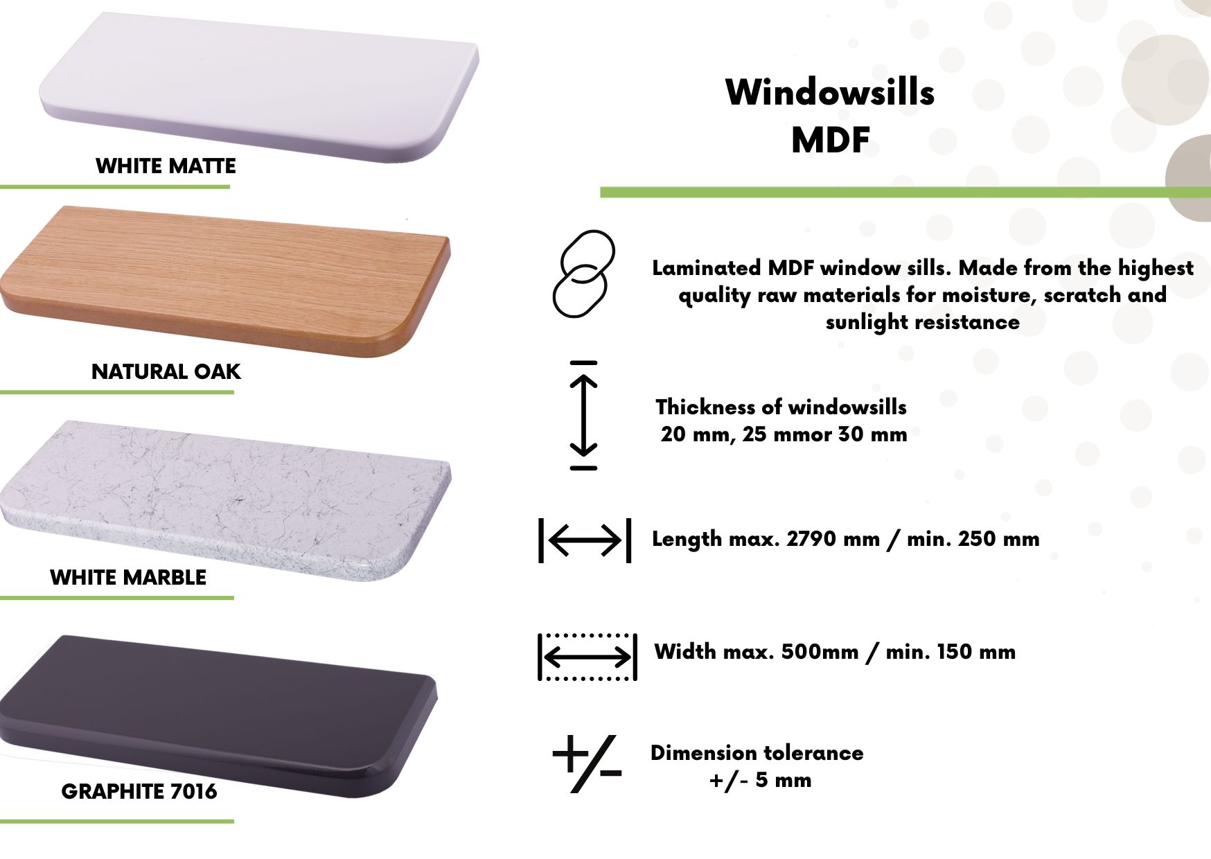 Aluminium or granite window sill? Or maybe conglomerate, which will give your interior a unique atmosphere. With us you can do it all! We offer a wide range of designs and materials.